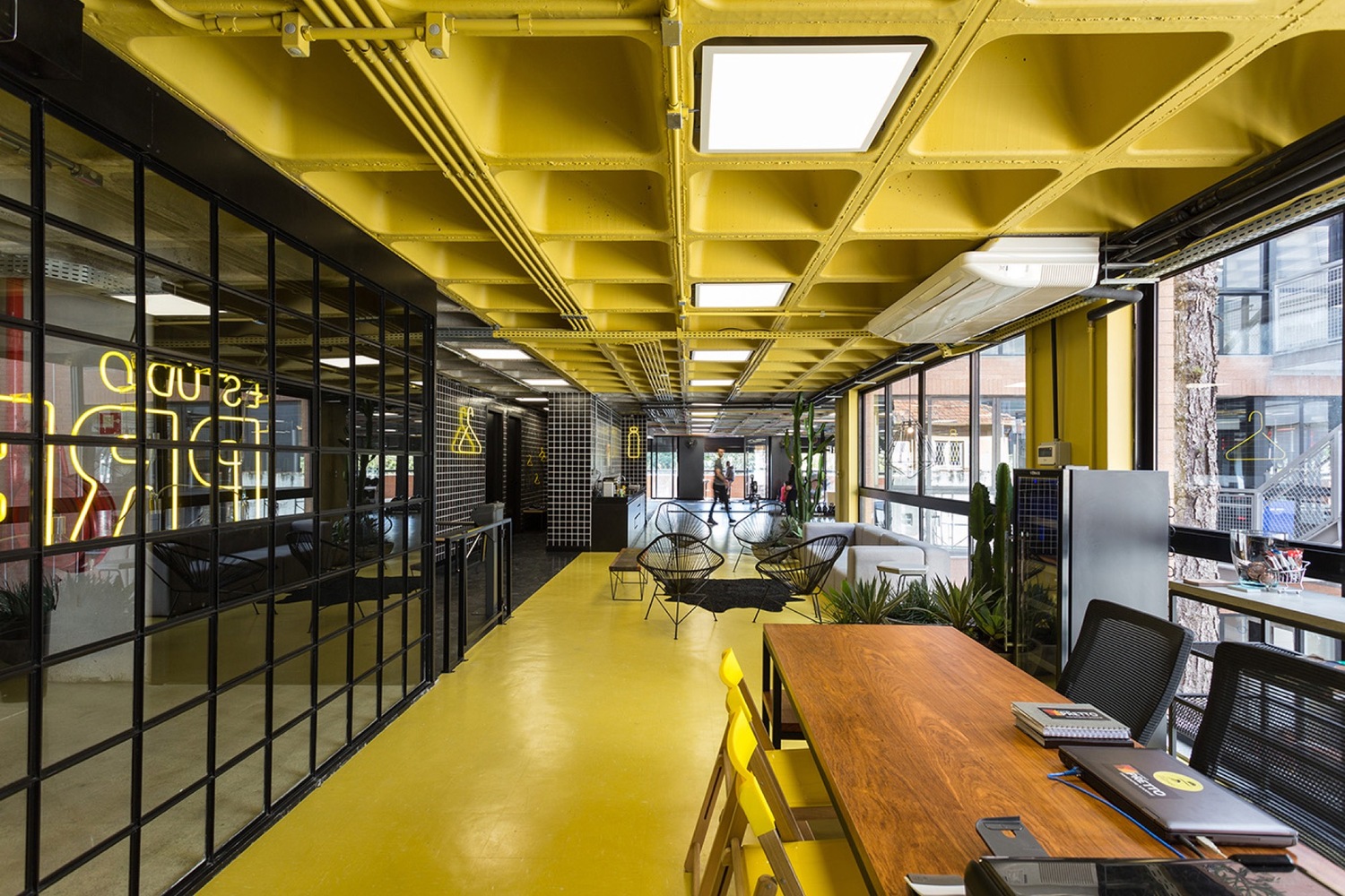主隔斷采用工業風格的棋盤形鐵架。小瓷磚和霓虹燈的使用也為工作室營造復古的氛圍。